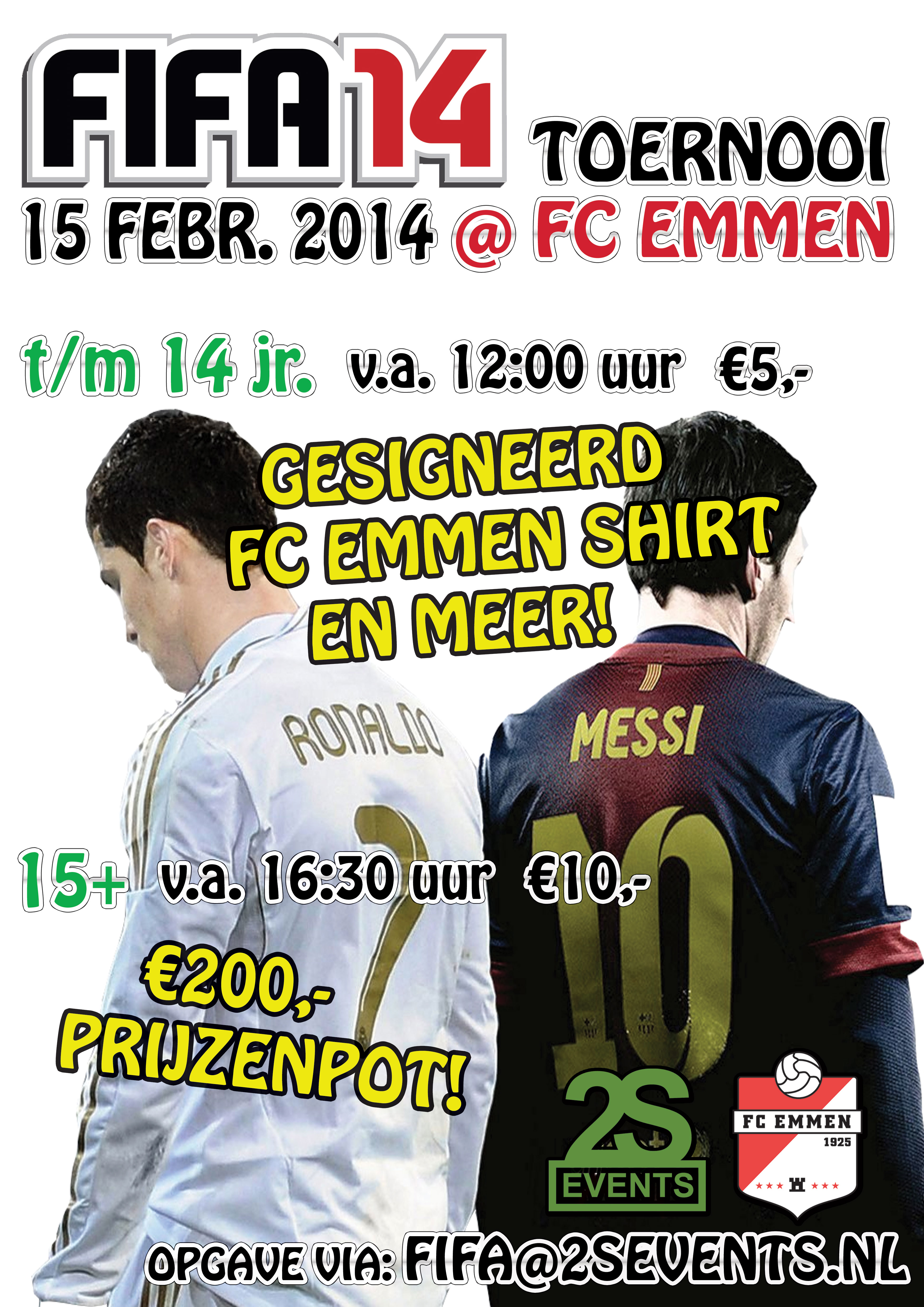 Bij FC Emmen wordt op zaterdag 15 februari een FIFA 14 toernooi georganiseerd door 2S Events. Dit vind allemaal plaats op de hoofdtribune van de club. In de bijlage vind u de poster van het evenement.